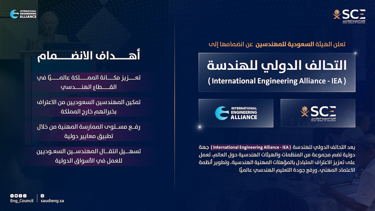ويُعد هذا الانضمام امتدادًا لتوجهات المملكة نحو الانخراط في المنظومات المهنية الدولية، ضمن مستهدفات رؤية السعودية 2030 الرامية إلى تعزيز التنافسية، وتنمية رأس المال البشري، ورفع جودة الممارسة المهنية في مختلف القطاعات، وفي مقدمتها القطاع الهندسي.