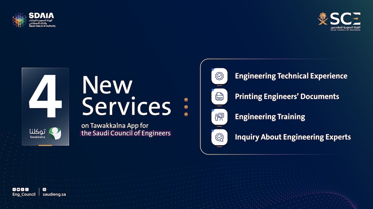 The Saudi Council of Engineers has announced the launch of four new electronic services through the national integrated application “Tawakkalna," operated by the Saudi Data and Artificial Intelligence Authority (SDAIA). This initiative comes as part of the Council's ongoing efforts to enhance digital engineering services and ensure flexible and efficient access for beneficiaries.